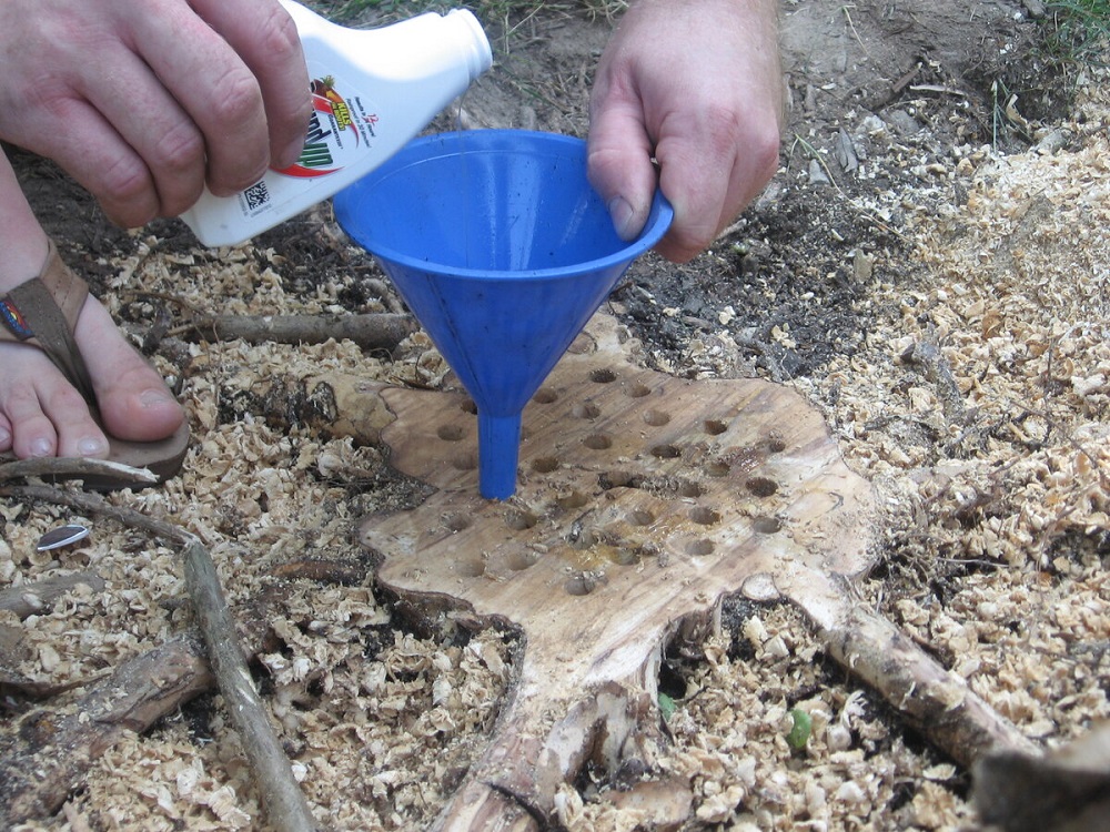 - Percez plusieurs trous dans la souche et remplissez-les de nitrate de potassium.