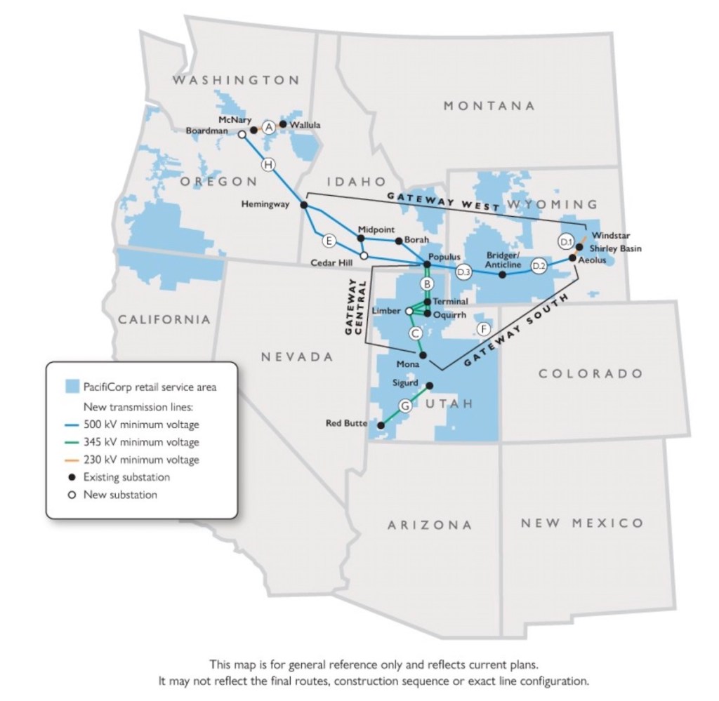 Cette carte représente les projets de transmission inter-États Gateway de PacifiCorp, reliant l’électricité éolienne du Wyoming aux clients dans toute la région de service multi-États du service public. (PacifiCorp)