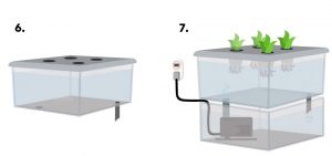 - Il reste à ajouter le substrat dans les pots, à placer les plantes, à remplir le récipient avec une solution nutritive au pH ajusté (5,8-6,2) et à allumer la pompe.
