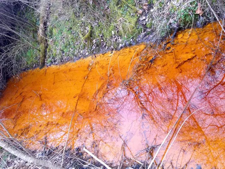 La réaction chimique forme de l’acide sulfurique et du fer dissous, dont une partie ou la totalité peut se séparer pour former des sédiments de couleur rouille qui deviennent visible au fond des cours d’eau pollués. Le ruissellement acide dissout les métaux lourds comme le cuivre et le mercure dans les eaux souterraines ou de surface.